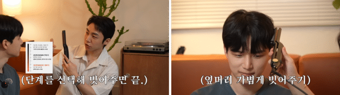 그 중 첫번째 영상에서는 남자 출연진인 정목, 현규, 재윤이 등장했는데요. 여기에 남성 뷰티 브랜드 ‘다슈’가 PPL로 참여했어요. 광고 제품은 다슈의 ‘그루밍 3종 세트’였고, 본격적인 Q&A에 앞서 규민이 제품을 간단히 소개하며 출연자들에게 직접 시연해주는 장면이 담겼습니다. 예를 들어 ‘변우석 고데기’로 유명한 데일리 이지 슬림 스타일러를 이용해 재윤의 옆머리를 눌러주거나, 데일리 볼륨픽으로 앞머리에 볼륨을 넣어주는 식이었어요. 손재주가 좋지 않아도 쉽고 빠르게 꾸밀 수 있다는 장점을 어필하면서요.