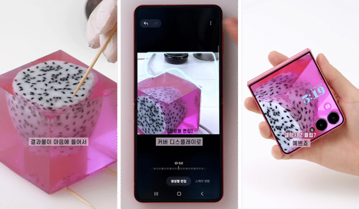 이에 요리 모형 크리에이터 ‘몽중다과’도 삼성전자와 함께 이 흐름에 탑승했습니다. 다만 특별한 점은 AI로 구현한 영상이 아니라 ‘AI ASMR 따라잡기’라는 콘셉트로 비현실적인 유리 과일을 직접 만들어보는 콘텐츠였다는 거예요. 그 과정에서 ‘갤럭시 Z 플립7’이 다양하게 활용되고 있죠. 예를 들어 제미나이에게 자신이 만들고 있는 유리 과일 모형을 보여주며 어떤 색이 좋을지 묻는 장면부터, 완성된 작품을 촬영하고 생성형 편집 기능을 활용해 퀄리티를 높인 뒤 커버 디스플레이 배경화면으로 설정하는 장면까지 이어집니다.