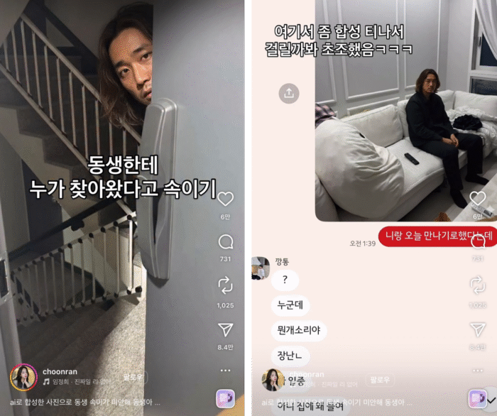 어디에서나 생성형 AI 콘텐츠를 볼 수 있는 요즘, 이를 활용한 신선한 아이디어도 계속해서 등장하고 있는데요. 최근엔 AI로 합성한 사진으로 장난을 치는 릴스가 주목받고 있습니다. AI를 이용한 사진이 놀랍도록 정교해진 덕분에 가능해진 콘텐츠죠. 예를 들어 집 현관이나 거실을 배경으로 AI에게 낯선 사람의 이미지를 합성해 달라고 부탁한 뒤, 이 이미지를 가족이나 친구에게 “이 사람 알아? 네 친구라던데”, “모르는 사람이 집에 들어왔어” 같은 메시지를 함께 전송하는 거예요. 이후 상대방이 실제 상황으로 오해하고 놀라는 순간을 기록해 SNS에 올리는 방식입니다.