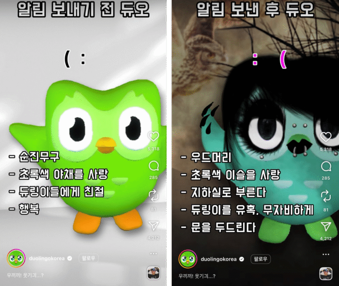 이 포맷도 유저들의 다양한 패러디를 이끌어냈는데요. 언어 학습 앱 듀오링고는 ‘듀오링고 알림 보내기 전과 후의 나’를 주제로 릴스를 제작했어요. 학습자에게 집요하게 공부하라고 알림을 보내는 특유의 캐릭터성을 살려, ‘문을 두드린다’, ‘지하실로 부른다’ 같은 다소 무서운 문구를 사용해 알림의 집착을 위트 있게 표현했습니다.