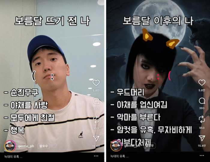 이번 릴스는 마치 늑대인간처럼 보름달이 뜨면 성격이 달라지는 ‘나’의 모습을 표현한 콘텐츠예요. 보름달이 뜨기 전에는 착하고 얌전한 모습이었다가, 보름달이 뜨고 나면 반항적이고 마초적인 성향이 되어버리는 모습을 담았죠. 이 릴스가 주목 받은 이유는 단순한 전후 비교보다는, ‘보름달이 뜬 후’의 모습을 표현하는 문구들이 어딘가 어설프다는 점이에요. ‘우드머리(우두머리)’, ‘야채를 업신여김’처럼 반항적이라기엔 어딘가 2% 부족해보이는 것이 웃음 포인트죠. 여기에 ‘emo’ 필터를 사용해 더욱 극적인 연출이 더해지면서 한층 재밌는 장면이 완성됐고요.