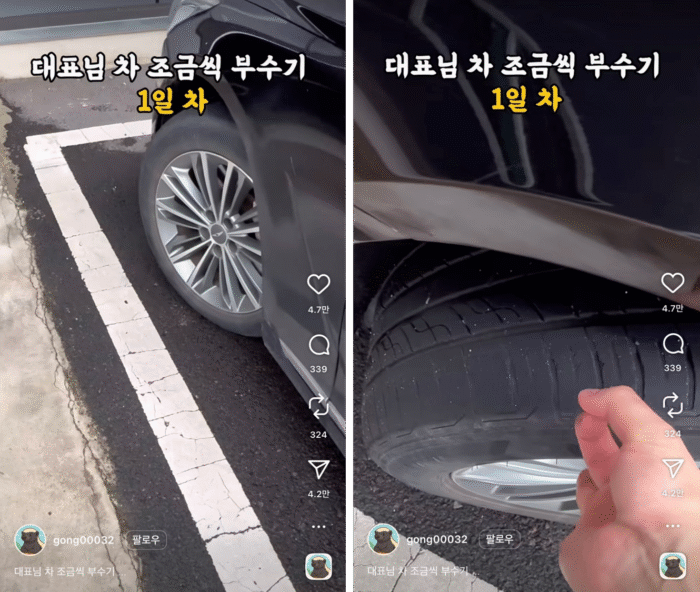 ‘조금씩 부수기’ 릴스는 말 그대로 무언가를 조금씩 망가뜨리는 과정을 매일 기록하는 시리즈형 콘텐츠예요. 처음 화제를 모은 영상은 “대표님 차 조금씩 부수기”라는 제목으로 시작됐는데요. 실제 영상에서는 ‘부순다’는 제목과는 달리 타이어에 딱밤을 살짝 때리는 수준의 하찮고 귀여운 행동만 보여줍니다.