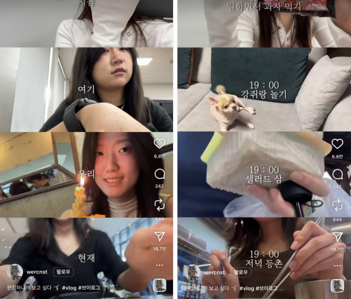 이제는 브이로그도 숏폼으로 제작되는 경우가 늘어나고 있죠. 마찬가지로 릴스에서도 서로 다른 친구들의 하루를 동시에 보여 주는 새로운 형태의 브이로그가 인기를 끄는 중이에요. 화면을 N분할 해서 각자의 공간에서 보낸 하루를 한 화면에 모아낸 이 릴스는, 직업과 생활 루틴, 촬영 구도까지 모두 다른 친구들의 모습을 비교하며 볼 수 있다는 점에서 흥미를 자아냅니다. 따로 찍은 영상을 이어 붙이기 때문에 촬영 방식도 자유롭고, 보는 입장에서는 마치 하나의 이야기처럼 느껴지는 재미도 있죠.