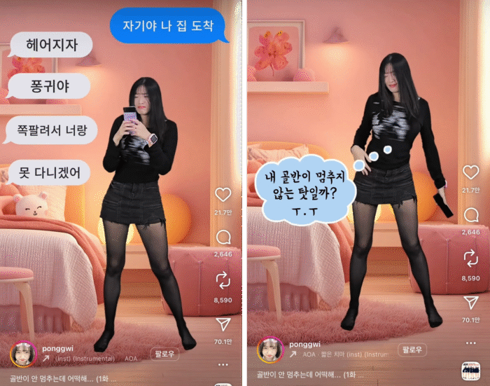최근 가장 화제가 된 릴스 중 하나는 바로 ‘골반 통신’이에요. 골반 통신이라는 단어는 크리에이터 ‘퐁귀’가 제작한 상황극 시리즈 <골반이 안 멈추는데 어떡해…>에서 생겨났습니다. 이 시리즈는 주인공의 골반이 멈추지 않는다는 독특한 설정과 함께 연인에게 이별 통보를 받으며 엉뚱한 전개로 이어지는데요. 여기에 “골반 통신: 이상 감지. 가속 모드.”, “내 골반이 멈추지 않는 탓일까…? ㅜ.ㅜ” 같은 촌스러운 자막까지 더해지며 웃음을 자아냈어요. 이 영상이 틱톡과 릴스를 중심으로 빠르게 확산되면서 BGM으로 사용된 AOA의 <짧은 치마>는 음원 차트 역주행을 하기도 했답니다.