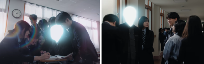 뮤비는 여기서 더 나아가, 빛의 아이 역시 빛 때문에 불편을 겪는 상황들을 보여줍니다. 군대에서는 야간 훈련 중 눈에 띄어 혼나고, 영화관에서는 관객의 시야를 방해해 데이트가 어긋나며 졸업사진에선 빛이 너무 강해 얼굴이 제대로 찍히지 않기도 하죠. 이처럼 뮤비는 빛의 장단점을 활용해 모든 인물에게 저마다의 결핍이 있음을 전달합니다. 덕분에 시청자들이 두 캐릭터 모두에 자연스럽게 공감할 수 있도록 만들었죠.