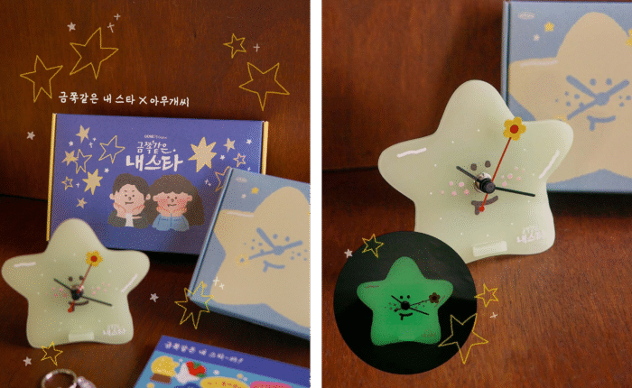 아무개씨는 브랜드 자체 굿즈를 바탕으로 다양한 협업을 이어가고 있어요. ENA 드라마 ‘금쪽같은 내 스타’와의 협업에서는 별을 테마로 한 야광 탁상시계와 키링, 스티커 세트를 선보였는데요. 기존에 브랜드에서 선보였던 ‘까마귀 프로젝트’ 야광 굿즈 라인업을 드라마 콘셉트에 맞게 재해석해 활용했답니다. 레트로한 톤앤매너와 유니크한 제품 콘셉트가 확실히 구축된 브랜드인 만큼, 복고 무드나 B급 콘셉트와 어울리는 브랜드와 특히 잘 맞을 것 같아요.
