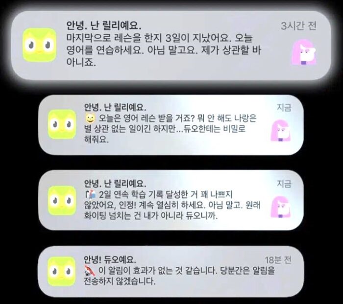 외국어 학습 앱 ‘듀오링고’는 초록색 부엉이 캐릭터 ‘듀오(Duo)’와 함께 매우 인상적인 마케팅을 펼치고 있습니다. 듀오는 친근함과 위협감(?)을 오가는 입체적인 페르소나를 지닌 캐릭터예요. 이런 성격을 기반으로 유저에게 푸시 알림을 보내는데요. 학습을 미루면 ‘어차피 알람이 유효하지 않을 테니 당분간 알람을 해제합니다’, ‘접속이 이어지지 않아 듀오는 죽고 말았습니다’ 같은 공격적인 메시지를 남기는 식입니다. 이 독특한 캐릭터성은 빠르게 밈화되며 많은 사람들의 주목을 받았어요.
