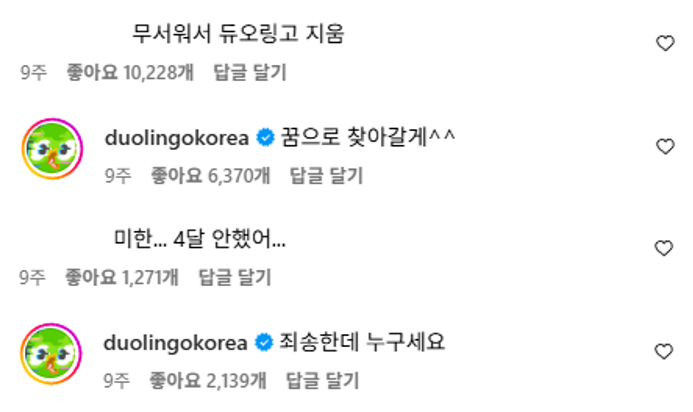 뿐만 아니라 듀오는 SNS 댓글에서도 유저들과 재미있는 티키타카를 이어가며 팬덤을 강화하고 있어요. 예를 들어 “오늘 공부하기 싫어요”라는 댓글에는 협박성 이모티콘이나 찾아가겠다는 메시지를 남기며 댓글창에서도 일관된 캐릭터 페르소나를 유지하고 있죠. 이런 상호작용은 유저들에게 듀오와 대화하는 재미를 주게 되고, 이는 곧 리텐션 향상으로 이어지게 되고요. 결론적으로 듀오링고는 듀오라는 위트 있는 페르소나를 활용해 재미없는 교육 앱이라는 이미지를 탈피하고, 브랜드 충성도를 높인 대표 사례라고 볼 수 있어요.