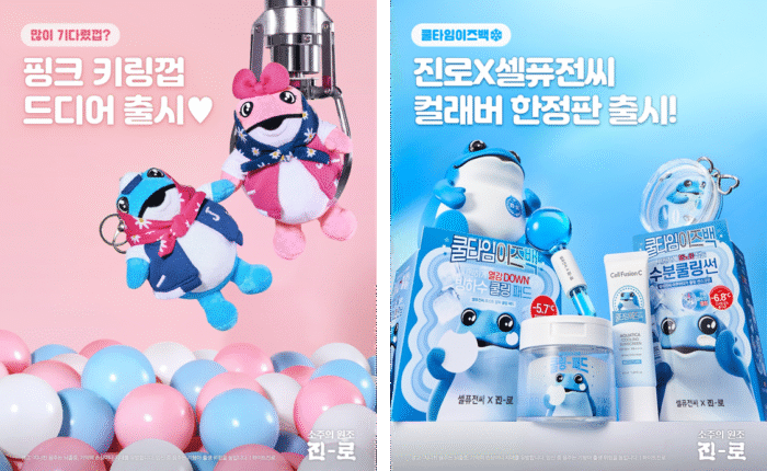 팝업 외에도 두꺼비를 활용한 자체 굿즈들이 꾸준히 출시되고 있어요. 이 굿즈들은 진로를 취급하는 매장에서만 구매할 수 있도록 해 제품과의 자연스러운 연결도 유도하고 있고요. 최근에는 화장품, 여행용품 등 주류와 무관한 브랜드와의 협업도 활발히 이어지고 있습니다. 음주와 직접적인 관련이 없는 제품군에서도 캐릭터 IP로서의 영향력을 확장하며, 마스코트를 브랜드의 독립 자산으로 성장시킨 대표적인 사례라 할 수 있어요.