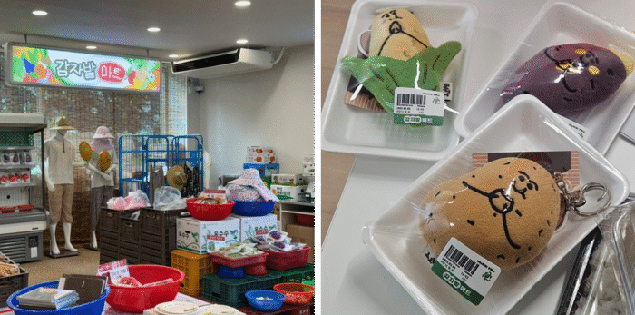 이후에는 뽀떼또의 친구 캐릭터들까지 등장하며 세계관이 확장되기 시작했어요. 애호박, 고구마, 가지, 레몬 등 각종 과일·채소 캐릭터들이 굿즈로 제작되면서, 감자빵이 아닌 캐릭터를 중심으로 한 팝업스토어 ‘감자밭 마트’까지 운영했죠. 다양한 캐릭터 키링과 함께 대표 빵 3종을 진짜 식자재 마트처럼 구성한 콘셉트였어요. SNS에서는 “키링 패키징 방식까지 너무 귀엽다”, “온라인 판매도 해줬으면 좋겠다” 등 긍정적인 반응이 이어졌습니다.