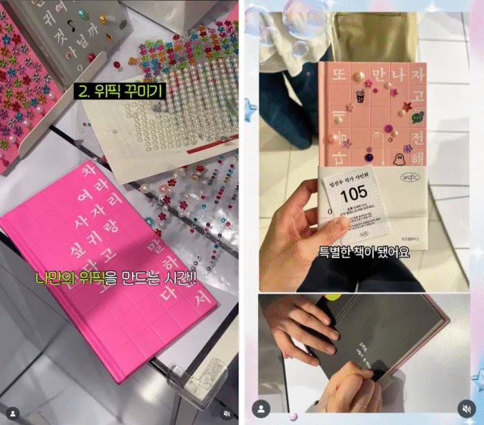 위픽은 책 꾸미기로도 유명한 시리즈예요. 바둑판 모양의 표지 덕분에 자신의 취향대로 책을 꾸미기 쉽죠. 위즈덤하우스는 이를 활용하여 ‘책꾸존’을 마련했습니다. 방문객들은 책꾸존에서 스티커와 마스킹테이프를 활용해 각자의 개성대로 책을 꾸미고, 인증 이벤트에 참여하면 추첨하여 선물을 받을 수 있었어요. 이렇게 책꾸 트렌드도 놓치지 않으며 팝업의 즐거움을 한층 더했답니다.