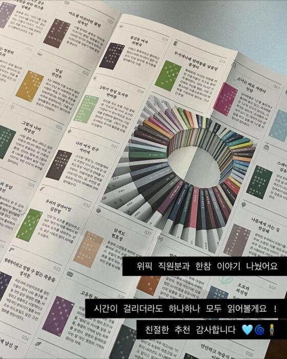 안전가옥이 장르연회 콘셉트로 몰입감을 선사했다면, 위즈덤하우스는 단편소설 시리즈 ‘위픽’의 100번째 출간을 기념하며 통일감 있는 연출을 보여주었어요. 위픽은 동일한 디자인을 바탕으로 각기 다른 컬러와 소설 한 문장을 담은 표지로 책마다 개성을 살려 수집하기 좋은 시리즈로 알려져 있죠. 이번 팝업에서는 100권의 책을 색이 잘 드러나도록 그라데이션으로 진열해, 마치 전시회를 보러 온 듯한 느낌을 선사했습니다. 한 눈에 보이는 배치로 인해 시리즈의 매력을 더욱 잘 느낄 수 있었어요. 100번째 출간을 기념해 100권의 책들을 정리한 독서목록과 표지를 미니 사이즈로 제작한 책갈피를 방문 굿즈로 제공했습니다.