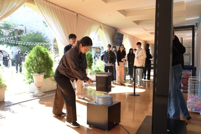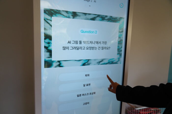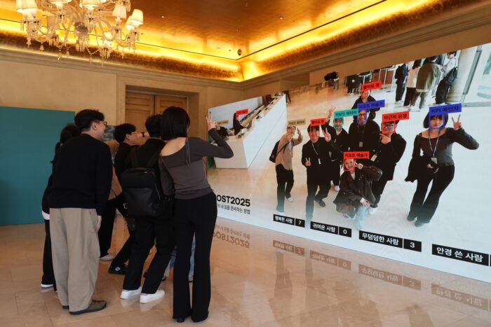 특히 참가자들의 눈길을 끈 것은 로비 정면의 벽을 가득 채운 디지털 사이니지였는데요. 참가자가 화면 앞에 서면 실시간으로 얼굴을 인식해 ‘숏폼 아티스트’, ‘트렌드 하이에나’, ‘레퍼런스 수집가’, ‘알고리즘 마스터’ 등 개인화된 라벨이 표시되었습니다.