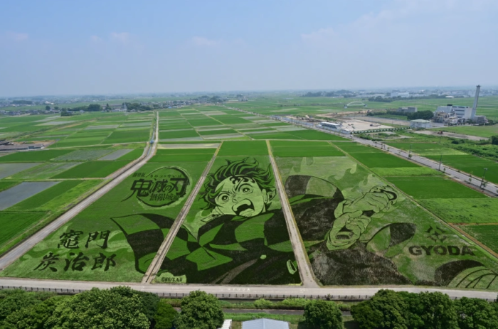 일본 사이타마현에 위치한 교다시 마을은 ‘논 아트(탄보 아트)’로 기네스 세계 기록을 보유한 마을이에요. 이 명성을 이어 매년 다양한 주제의 대형 아트를 선보여 왔고 올해 이 자리를 귀멸의 칼날이 차지한 겁니다. 2.8헥타르 면적에(무려 2,600평!) 물감을 대신해 품종이 다른 벼를 심어서 멀리서 보면 선명하게 귀멸의 칼날 주인공 ‘카마도 탄지로’의 모습이 드러나요. 👀 이 장관을 직접 목도하기 위해 일본은 물론 국내에도 여행 상품이 나왔을 정도죠!