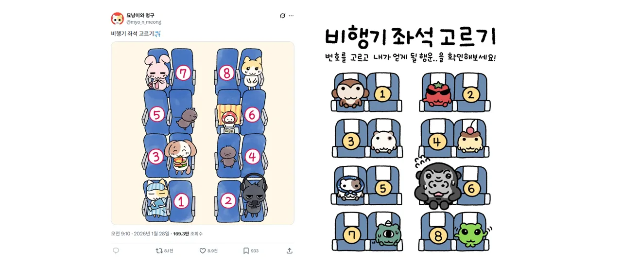 장시간 비행에서는 옆에 앉는 사람이 중요하죠. 나와 잘 맞는 사람과 함께라면, 피곤한 비행 시간이 더 즐겁잖아요~ 이런 점을 활용해 요즘 유행 중인 콘텐츠가 있어요. 바로 장시간 비행기 좌석 밈입니다. 비행기 좌석에 캐릭터나 인물을 배치하고 옆자리를 번호로 표시한 뒤에 ‘당신이라면 어느 좌석을 고를 건가요?’하고 묻는 형식인데요. 각 인물과 캐릭터의 성격이 달라 각자 고르는 자리도 다르다는 점이 재미 포인트예요.