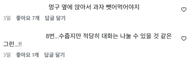 실제로 댓글을 살폈을 때, 좌석 번호와 함께 왜 이 좌석을 골랐는지 이유를 말하는 반응이 많았습니다. 옆에 앉은 캐릭터에게 어떤 행동을 할 건지, 혹은 캐릭터와 어떤 대화를 나눌 건지 등 캐릭터와 상호 작용을 상상한 듯한 내용이 다양했죠. 이처럼 좌석 밈은 이미지에 나와 있는 대상의 특성을 참여자가 추측하고 본인이 원하는 바를 말하며 반응하게 만드는 것이 핵심입니다.
