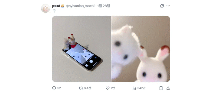 이 인증샷을 찍을 때 촬영된 사진 뿐만 아니라, 인증샷을 찍는 과정을 담은 사진을 함께 올리기도 해요. 카메라 근처에 서 있는 캐릭터와 찍히고 있는 화면이 같이 나오도록 말이죠. 어쨌든 핵심은 내려다보는 각도를 통해 깜찍함을 어필한다는 점입니다. 그러니 우리 브랜드에 캐릭터 굿즈가 나오거나 캐릭터 IP와 콜라보할 예정이라면, 빠르게 이 포맷을 활용해 보면 어떨까요?