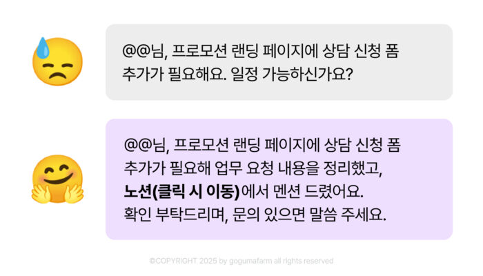 개발자는 요청에 대한 ‘Why’를 이해해야 움직입니다. 그렇기에 필요한 이유는 물론 이 작업을 하지 않으면 우리가 업무적으로 어떤 어려움을 겪게 되는지 구체적으로 설명하는 게 좋아요. 여기에 기대 효과까지 덧붙이면 설득력은 커집니다. 예를 들어 ‘랜딩 페이지에 상담 신청 폼 기능 추가’ 요청을 한다고 해봅시다. 아래와 같이 작성할 수 있어요.