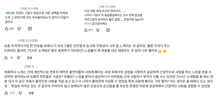 댓글 반응은 이러한 전략이 통했음을 보여줍니다. 출연자를 평가하거나 비방하기보다 사람들은 순간의 장면을 복기하고, 분위기를 이야기합니다. ‘저 감성 좋았어’, ‘그 장면에서 울컥했어’ 같은 반응이 쌓였죠.