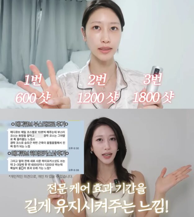 와코는 메디큐브와 협업하여 ‘에이지알 부스터프로’라는 홈케어 기기 PPL을 진행하기도 했어요. 집도 구해야 하고, 영상 편집도 해야 하고, 학원까지 다니느라 너무 바빠서 관리할 틈이 없었다며, 이 때문에 모공이 너무 넓어졌다는 자신의 피부 상황을 언급하며 광고를 시작했는데요. 이때 제품을 등장시켜 실제로 사용하면서, “각질을 태워주고, 모공이 쫀쫀해지며 화장이 잘 먹는다”라는 강점을 설명합니다. 특히 인상적인 건, 광고임에도 불구하고 유의사항을 확실히 짚어주었다는 점이에요. 무작정 좋다고만 하는 것이 아니라 조금 따가움이 느껴질 수 있고, 주 2~3회 정도만 사용해도 좋다는 솔직한 멘트는 시청자들의 신뢰도를 높여주었습니다.