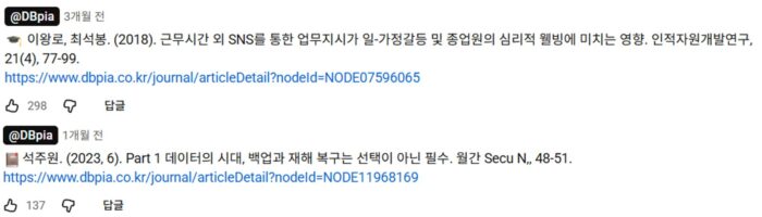디비피아는 인스타그램 잘 하는 브랜드로 꾸준히 주목을 받고 있는데요. 이제는 인스타 뿐만 아니라 유튜브도 가지고 있는 자산을 적절히 활용하며 밈 친화적인 모습으로 잘 운영하고 있습니다. ‘Ctrl+S를 안 하고 방심하던 날‘에서는 데이터 백업 논문을, ‘휴가 중에 미안하지만 자료 좀 수정해줄 수 있겠니?‘에는 근무시간 외 SNS 업무지시 관련 논문을 댓글에 고정해 디비피아 접속으로 이어지게 했어요. 제목과 찰떡같은 논문 선택으로 브랜드 이미지를 한층 유쾌하게 변화시킨 사례였죠.