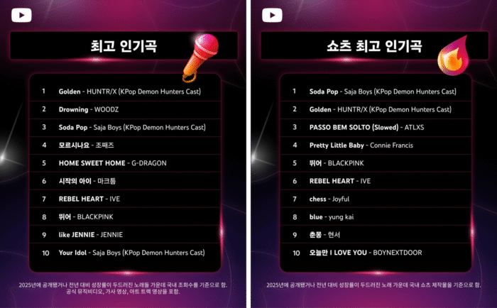 2025년 유튜브 최고 인기곡 리스트를 살펴보면 아무래도 가장 먼저 눈에 띄는 건 케이팝 데몬 헌터스의 강세입니다. 극 중 가상의 아이돌 그룹 헌트릭스의 ‘Golden’, 사자 보이즈의 ‘Soda Pop’과 ‘Your Idol’까지 총 세 곡이 톱10에 나란히 올랐죠. 다만 이 결과를 단순히 콘텐츠 자체의 인기로만 보기보다는 팬 커버, 댄스 챌린지, AI 커버 영상 등 다양한 형식으로 재생산되고 유통된 결과라는 점에 주목할 필요가 있어요.
