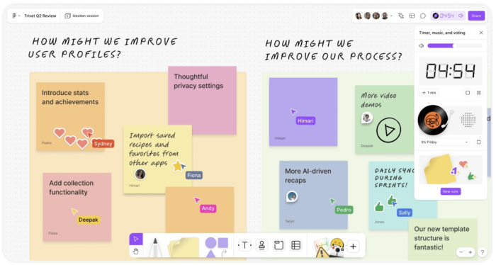 아이디어는 눈에 보이게 잘 기록 및 정리돼야 참가자들의 이해도를 높일 수 있어요. 그렇기에 화이트보드나 협업 툴 등 기록 도구를 미리 준비하는 게 좋습니다. 화이트보드에 참가자의 아이디어를 마인드맵으로 정리하거나 피그마의 피그잼(FigJam)을 활용해 볼 수 있어요. 피그잼은 기명·익명으로 스티커 메모를 붙일 수 있고 타이머 기능을 활용해 한정된 시간 내 집중도 있게 아이데이션을 진행할 수 있습니다.