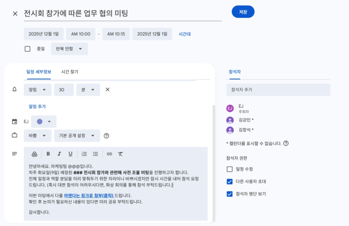 만약 의사결정이 필요한 사안이 있다면 결정권자가 빠르게 판단할 수 있도록 관련 자료를 사전 정리해 드리는 것도 중요합니다. 업무 현황과 일정뿐 아니라 필요한 예산, 의사결정 포인트를 번호로 나누어 정리하면 훨씬 전달이 수월해요. 선택지별 예상 장단점까지 간단히 정리해 두면 회의에서 불필요한 반복 설명을 줄일 수 있습니다. 이렇게 정리한 사항은 회의 초대 캘린더를 보내거나 안내 메시지를 보낼 때 첨부하도록 해요.