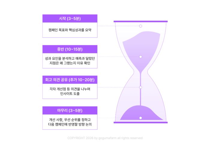 성과 리포트를 공유하는 정도라면 15~20분 내로 진행하도록 합니다. 만약 피드백, 회고까지 함께 진행하는 형식이라면 10~20분 정도가 더 추가해 총 20~40분 내로 마무리해요.