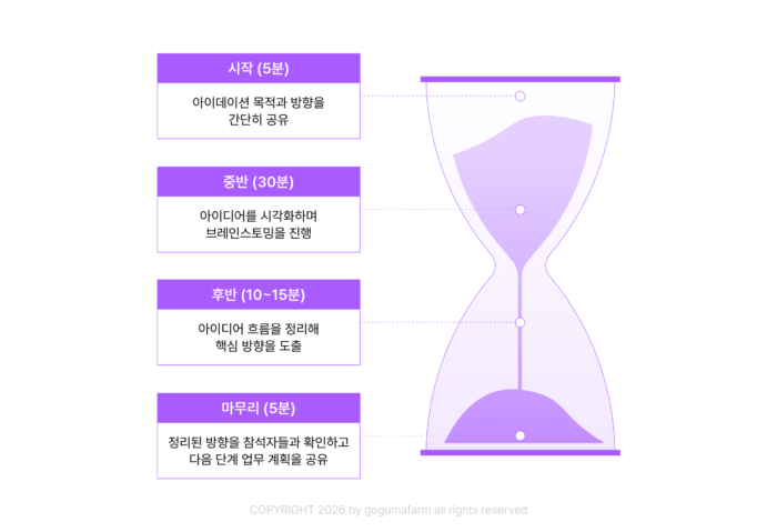 아이데이션 회의는 50~60분 이내로 끝내도록 합니다. 아래와 같이 초·중·후반으로 나눠 미팅을 주도하는 것이 좋아요.