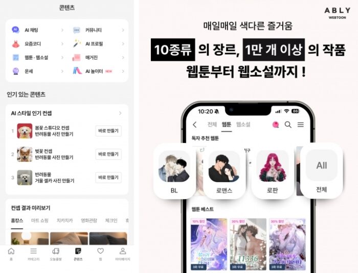 맞아요. 그 힘은 콘텐츠에 있습니다. 패션, 뷰티 상품 탐색은 물론이고 웹툰, 웹소설, 커뮤니티, AI 놀이터 등 즐길 수 있는 콘텐츠 요소도 제공하고 있어요.