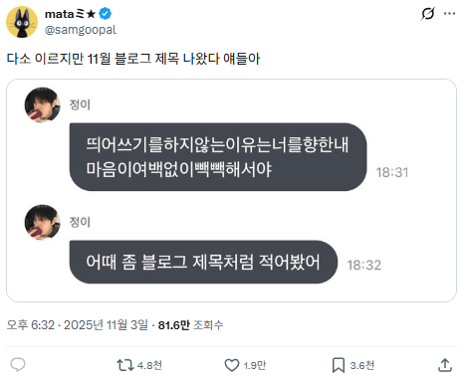 아이돌 그룹 휘브의 멤버 ‘이정’이 팬에게 “띄어쓰기를하지않는이유는너를향한내마음이여백없이빽빽해서야”라는 메시지를 보낸 것을 계기로 시작된 밈이에요. 이정은 팬들과의 대화에서 일부러 블로그 제목처럼 말해봤다고 전했는데요. 실제로 엑스에서는 감성적인 문장을 보면 “이번 달 블로그 제목 나왔다”라고 반응하는 문화가 자리 잡고 있었기 때문에, 이 흐름과 딱 맞아떨어지며 더욱 빠르게 확산됐습니다. 이정 본인도 반응이 이렇게 클 줄은 몰랐다며 놀라워했죠.