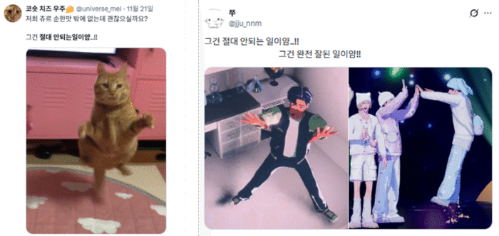 이후에는 각자의 최애 사진이나 점프하는 인물 사진을 활용해 “그건 절대 안되는 일이얌..!!”이라는 문장을 덧붙이는 방식으로 활용되고 있어요. 특히 무언가를 귀엽게 거절하거나 부정하는 의미를 표현할 때 자주 쓰이고요. 반대로 “그건 완전 잘된 일이얌..!”처럼 문장을 변형해 긍정적인 상황에 쓰이기도 해요.