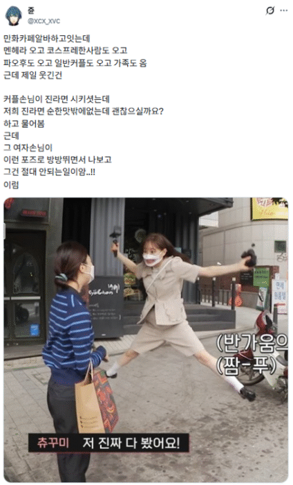 이 밈은 엑스에 올라온 한 유저의 썰에서 시작됐어요. 한 커플 손님이 진라면을 주문하자 직원이 “순한맛밖에 없는데 괜찮으실까요?”라고 묻자, 여자 손님이 갑자기 점프하며 “그건 절대 안 되는 일이얌..!!”이라고 외쳐 당황스러웠다는 이야기였죠. 유저는 가수 츄가 마치 만화 캐릭터처럼 팔과 다리를 쫙 벌리고 점프한 사진을 예시로 첨부했는데요. 과장된 리액션과 찰떡같은 사진 조합이 웃음을 자아내며 빠르게 밈으로 확산됐습니다.