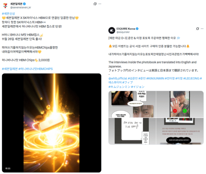 브랜드가 활용할 때는 제품에 대한 애정, 혹은 풍성한 구성을 강조하고 싶을 때 이 구조를 그대로 차용해볼 수 있어요. 예를 들어 세븐일레븐은 “띄어쓰기를하지않는이유는HBMChips를향한내마음이여백없이빽빽해서야💛”라는 문구로 신제품을 소개했고, 에스콰이어는 자사 포토북을 홍보하며 “포토북안에엄청난사진과콘텐츠가빽빽해서야”라는 문장으로 구성의 풍성함을 강조했죠. 특히 블로그, 댓글처럼 텍스트 중심 채널에서 가볍게 활용할 수 있는 구조인 것 같아요.
