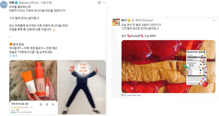 뷰티 브랜드 어퓨는 “트러블 올라왔는데 어퓨 후시디움 라인을 모른다고? 그건 절대 안되는 일이얌..!!”이라는 문구와 함께 실제 직원이 점프하는 모습을 촬영해 밈을 패러디했어요. SM엔터테인먼트는 NCT 정우의 첫 솔로 싱글 발매 광고에서 “오늘 첫 싱글이 나온다고? 그건 절대 잊으면 안되는 일이얌..!!”이라는 문구를 활용해 발매일을 강조했고요. 브랜드가 강조하고 싶은 메시지나 놓치면 안 되는 정보를 부각하고 싶을 때, 해당 밈의 말투와 포즈를 함께 활용해 보세요!