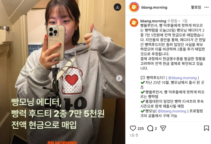 브랜드가 이 밈을 활용할 때는 제품의 긍정적인 구매 경험을 ‘과장된 뉴스 헤드라인’처럼 표현하는 방식이 가장 자연스러워요. 예를 들어 빵덕후 커뮤니티 ‘빵모닝’은 ‘빵력 후드티’를 추가 구매한 에디터의 사연을 기사체로 풀어내며 “한 달간 같은 옷만 입다 추가 매입한 것으로 추정됩니다”라는 문장을 더해 제품 소개와 구매 이유를 센스 있게 녹여냈죠. 이처럼 제품 정보나 혜택을 뉴스 문체 속에 자연스럽게 섞어 전달하면, 밈 특유의 유머를 해치지 않으면서도 브랜드 메시지를 효과적으로 담을 수 있어요.
