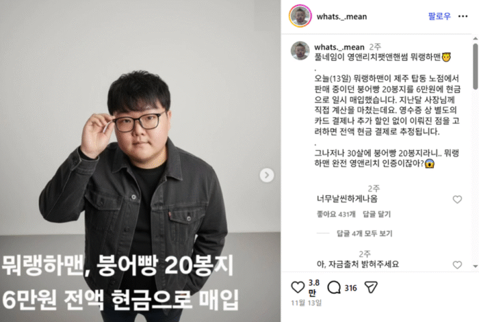 사소한 소비도 마치 대단한 부동산 거래처럼 표현하는 게 이 밈의 핵심입니다. “[이름], [사소한 아이템] [가격] 전액 현금으로 매입”이라는 포맷만 따르면 되는데요. 예를 들어 “퇴근하던 김모씨, 타코야끼 10알 전액 현금으로 매입”, “붕어빵 3마리 전액 현금으로 매입”처럼, 작지만 행복한 지출을 뉴스 헤드라인처럼 과장되게 말하는 거예요.
