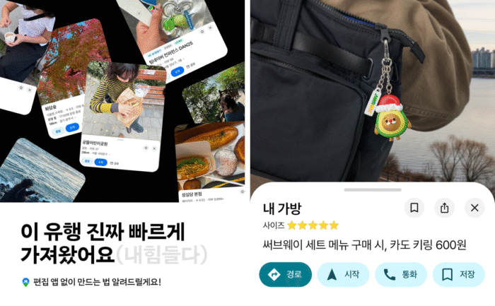 네이버 지도는 이 트렌드를 빠르게 포착해, 자사 지도 서비스로 비슷한 인증샷을 만드는 튜토리얼 콘텐츠를 제작해 공유했어요. 써브웨이는 굿즈 ‘아보카도 키링’을 홍보하며 이 포맷을 활용했는데, 위치명은 ‘내 가방’, 평점은 별 다섯 개, 설명란에는 구매 정보를 기재했죠. 이처럼 ‘위치’나 ‘공간’과 관련된 제품이라면 구글맵 인증 포맷을 활용해 콘텐츠에 재미를 더해보는 것도 좋을 거예요.