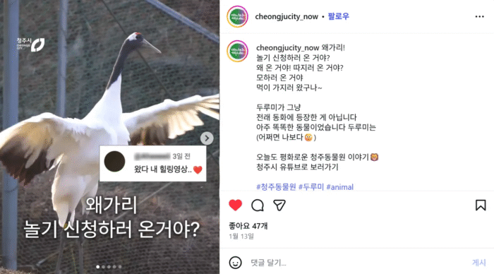 밈에서 대상에 대한 애정이 드러나는 만큼, 캐릭터나 모델 등 유저가 애정을 가질만한 대상이 있을 때 활용하기 좋아요. 예를 들어 청주시는 청주 동물원의 왜가리 영상을 홍보하면서 이 밈을 썼는데요. 왜가리가 두루미 보호장에 와 먹이를 먹는 영상의 내용을 귀엽게 전달할 수 있었어요.