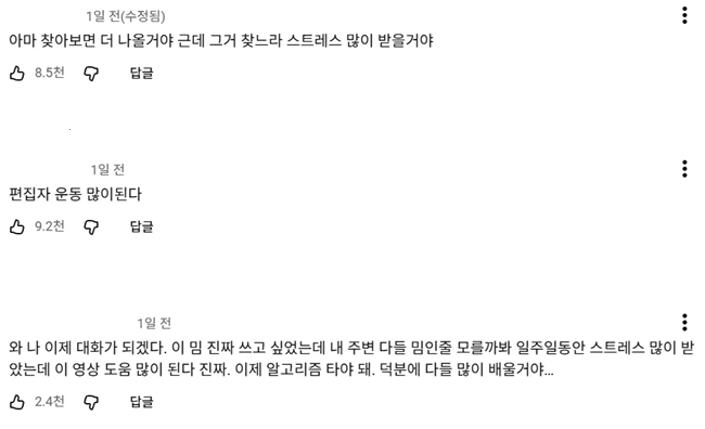 유튜브 채널 김해준 ‘낭만부부’에서 우연히 인터뷰를 한 중년 시민의 손동작에서 시작된 밈이에요. 해당 영상이 인기를 얻으면서 이 밈도 덩달아 입소문을 탔는데요. 좋다는 말과 함께 그냥 엄지 척만 하는 게 아니라, 새끼 손가락과 엄지를 왔다 갔다 하는 손동작이 유쾌한 포인트가 되어 밈으로 자리 잡았죠. 이 장면은 댓글에서도 손동작 이모지와 함께 계속 언급되고 있어요.