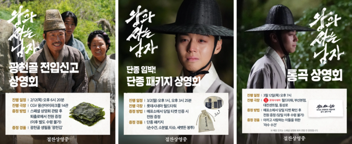 영화 관객 지표를 끌어올리려면 N차 관람을 유도하는 전략이 중요하죠. 이때 <왕과 사는 남자>는 영화 속 요소를 활용한 네이밍과 굿즈로 이색 상영회를 선보였어요. 예를 들어 배경인 ‘광천골’을 살린 전입신고 상영회에서는 ‘광천골 생필품’이라며 광천김을 제공했고요. ‘단종 임박’이라는 언어유희를 활용한 상영회에서는 단종과 관련된 쌀, 손수건 등으로 구성한 단종 패키지를 제공했어요. 또 비극적인 결말에 과몰입한 관객을 겨냥해 ‘통곡 상영회’도 열었는데요. 굿즈였던 수건을 눈물 닦는 용도로 미리 나눠주는 센스가 돋보였죠.