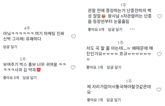 이에 반응도 긍정적으로 이어졌어요. 김을 제공했던 ‘광천골 전입신고 상영회’에는 마케팅이 신박하고 귀엽다는 반응이 많았죠. ‘통곡 상영회’는 영화에 대한 애정과 함께 매진으로 참여하지 못해 아쉽다는 반응이 주를 이뤘어요. 해당 상영회는 엑스에서도 약 1.7천 회 이상 바이럴 됐고요.