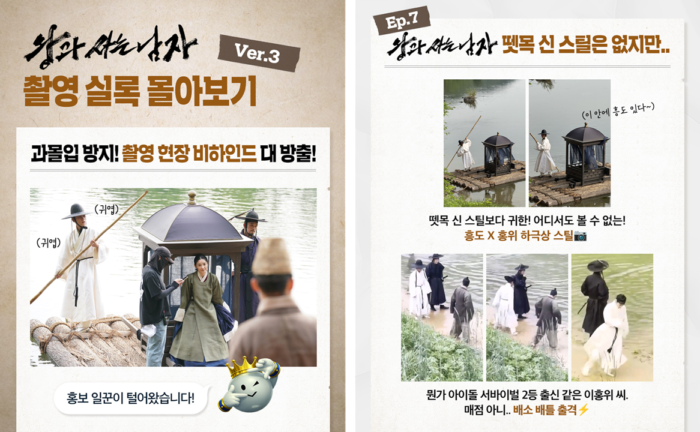 과거 엑스에서 박지훈(이홍위 역)의 포스터 비하인드가 크게 화제가 된 적이 있는데요. (이홍위가 물장난을 치는 장면은 원래 없었지만, 배우 유해진의 제안으로 추가된 장면이라고!) <왕과 사는 남자>는 이러한 관심 포인트를 놓치지 않고 촬영 실록에서 해당 일화를 자세하게 풀었습니다. 그리고 이를 본 팬들의 재공유를 통해 작품에 대한 몰입이 확산되며 2차 바이럴로도 이어졌죠.