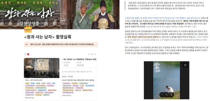 <왕과 사는 남자>처럼 과몰입을 유도하는 작품은 관람 이후 감정의 여운에서 빠져나오기 위해 비하인드를 찾아보는 팬들이 많아요. 이런 비하인드 콘텐츠는 자연스럽게 추가 바이럴 포인트가 되거나 관심을 이어가는 역할을 하기도 하고요. <왕과 사는 남자>는 노션을 활용해 ‘촬영 실록’을 공개했어요. 과거 왕의 기록을 빠짐없이 적었다는 조선왕조실록에서 착안한 네이밍을 콘셉트로 잡은 건데요. 새로운 내용이 올라올 때마다 공식 인스타그램과 엑스를 통해 안내하면서 팬들의 관심을 꾸준히 유지하고 있죠.