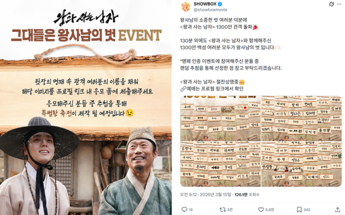 연이은 흥행 속에서 <왕과 사는 남자> 팀은 관객에 대한 보답도 놓치지 않았어요. 영화 속 명패와 ‘벗’이라는 요소를 활용해 관객 이름을 담은 이미지를 응모받은 뒤, 이 중 130명을 추첨해 1,300만 관객 돌파를 기념하는 축전을 제작했죠. 해당 게시글은 엑스에서 3천 회 이상 공유되며 관객도 함께 기쁨을 나누는 분위기가 만들어졌어요.