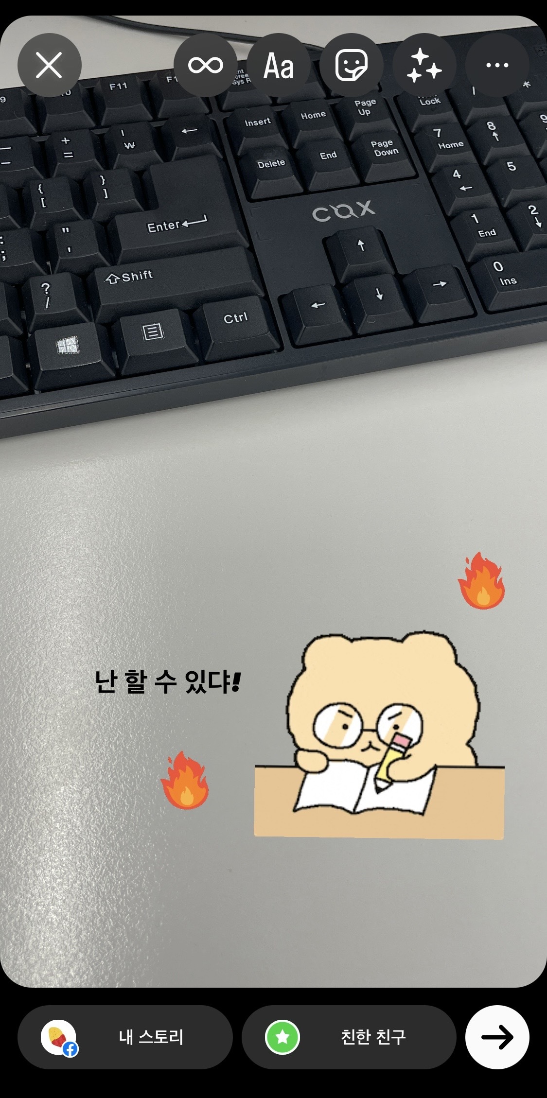 먼저 만들고 싶은 템플릿을 생각하며 스토리를 꾸미면 되는데요. 에디터는 오늘 하루도 파이팅할 수 있도록 ‘난 할 수 있다!’ 템플릿을 만들어 보려고 해요. 인스타그램 스토리의 기본 기능인 ‘GIF’에 귀여운 ‘망그러진 곰’과 ‘불’을 검색해 해당 이미지를 붙여 넣었죠.