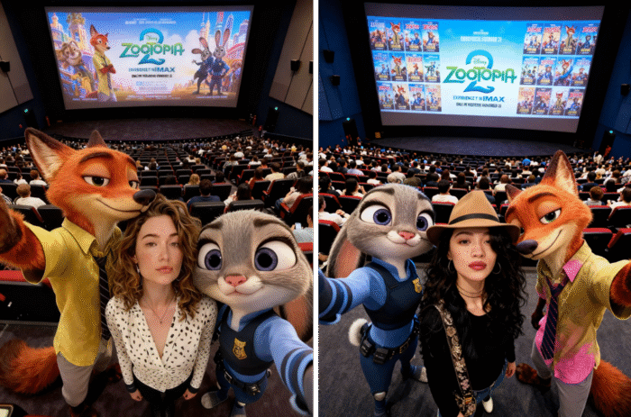 공식 챌린지 외에 팬들이 자발적으로 만든 콘텐츠도 주목할 만해요. 특히 중국에서는 ‘AI 닉주디 인증샷’이 유행처럼 번지고 있습니다. 중국의 AI 이미지 생성 앱 ‘豆包(도우바오)’에 공유된 프롬프트를 활용하면, 마치 닉과 주디와 함께 영화관에서 셀카를 찍은 듯한 이미지를 만들 수 있어요. 해당 프롬프트는 빠르게 확산되며 다양한 AI 플랫폼에서도 공유되고 있고요.