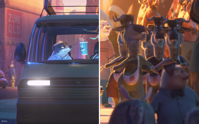 <주토피아>는 전작에서도 현실의 브랜드들을 주토피아 세계관에 맞게 패러디해 영화 속 이스터에그를 숨겨 놓은 것으로 유명했어요. 구글은 ‘Zoogle’, 룰루레몬은 ‘Lululemmings’로 등장해 주토피아 감성을 덧입은 재치 있는 변형을 보여준 바 있죠.