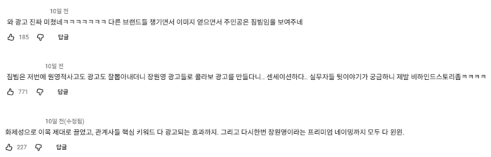 이러한 포인트가 단순히 브랜드 내부 의도에 그치지 않고 소비자에게 전달됐다는 점 역시 주목할 만해요. “센세이션하다”, “주인공은 짐빔임을 보여주네”라는 감탄과 함께 광고 제작 비하인드가 궁금하다는 이야기까지 나왔거든요. 이로써 공들인 기획 자체가 소비자 반응을 끌어내는 요소로 작용한다는 점도 보여줍니다.